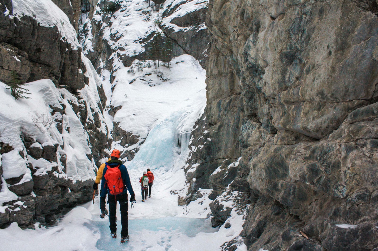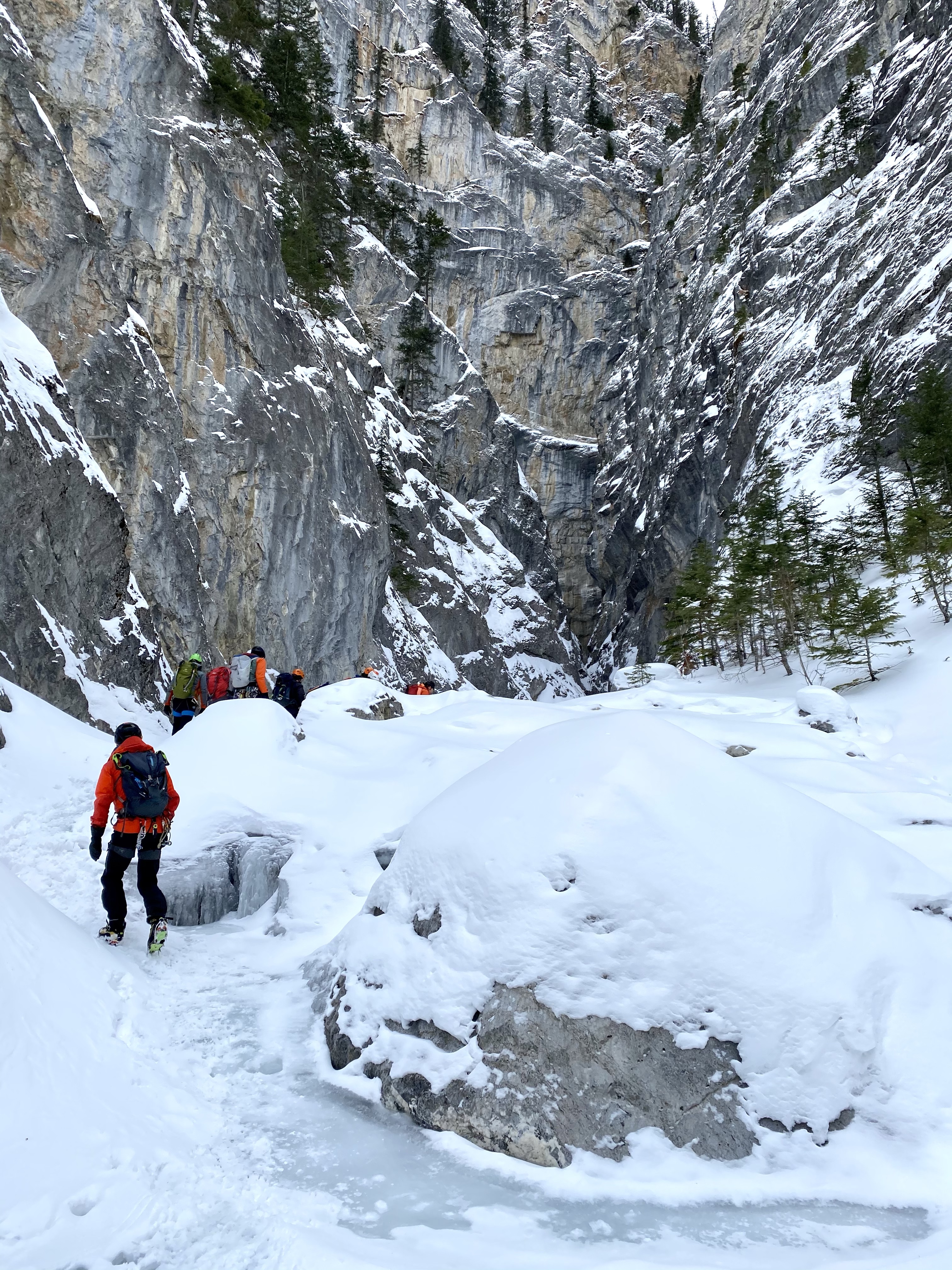 After about a 20-min hike up the right-hand bank, we put on our crampons and followed the frozen creek the rest of the way up the canyon. There are a number of short ice steps to navigate as you make your way, and we stopped to listen to the sounds of a zillion water drops at “The Big Drip”.
