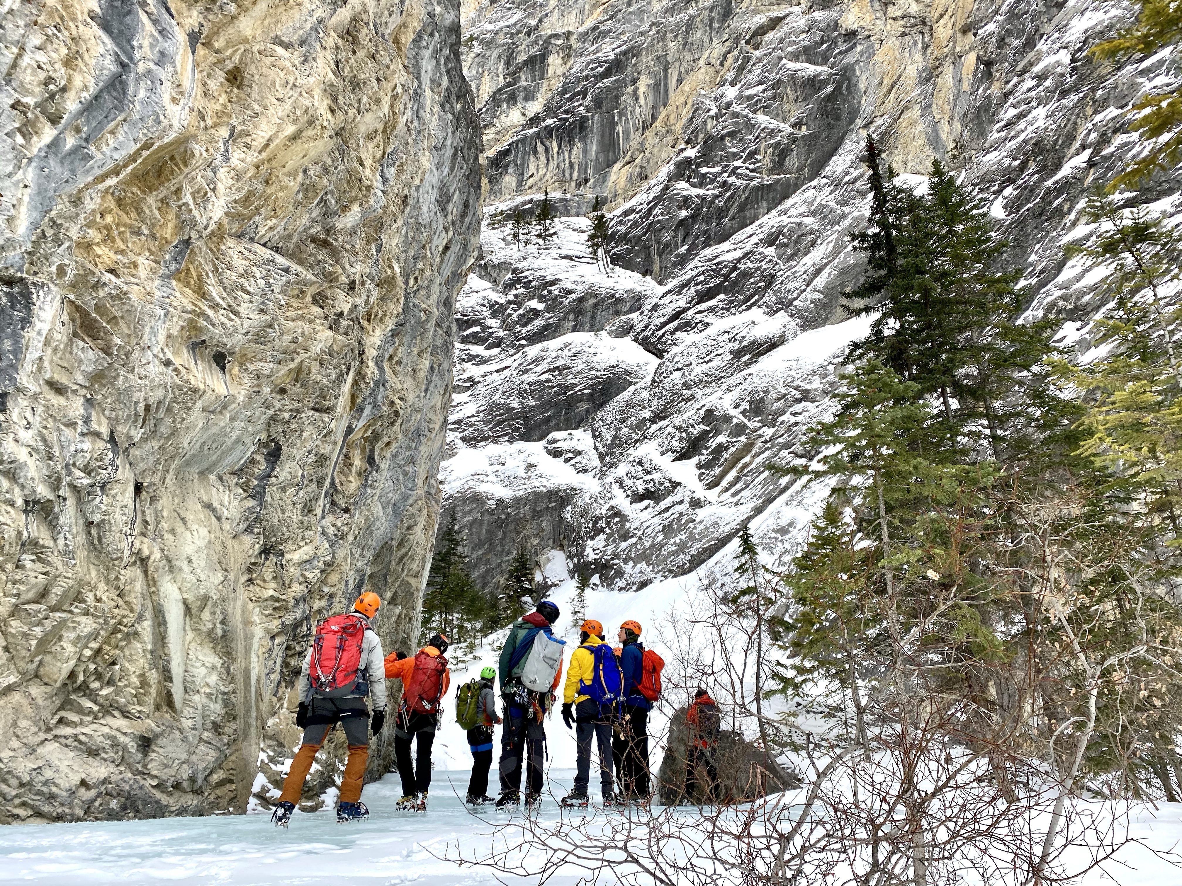 Wandering up this canyon and doing a couple laps on “Lovely Parting Gifts” made for a sweet close to a full weekend of ski touring and swinging tools for our group of pandemic-weary climbers. We were approximately 6 hours car-to-car, moving 7.5km round-trip at a relaxed pace with around 500m of elevation gain, and taking lots of photos of this super-picturesque destination. We parked on the west side of the highway and started hiking up the right-hand bank of the creek, and on the way out followed the creek back to the highway.